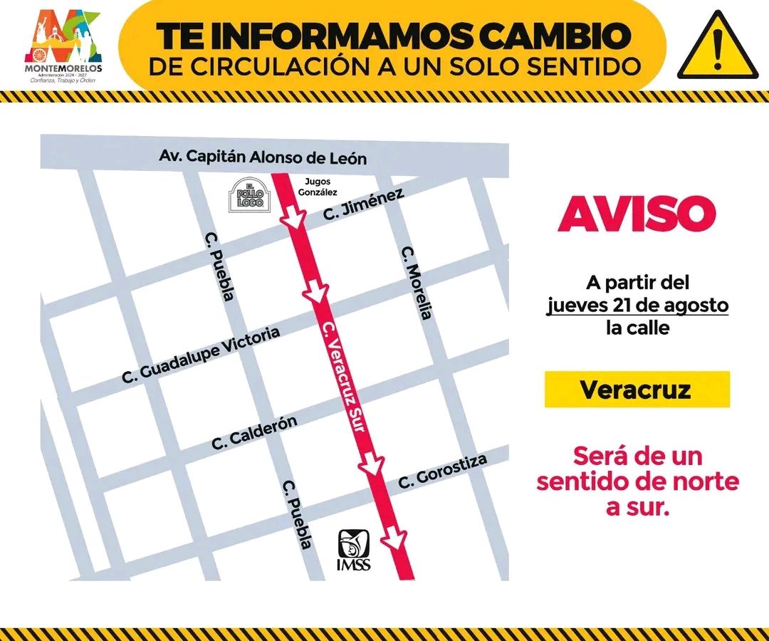 Noticias/agosto 21, 2025/215 views /Noticias Montemorelos A partir de este jueves 21 de Agosto la calle Veracruz será de un solo sentido #MontemorelosNLshare on:FacebookTwitterEmailSend to Email Address:Your NameYour Email AddressEmail check failed, please try againCancel Tags:Noticias Montemorelos previous articleINVITA DAVID DE LA PEÑA A LA COMUNIDAD DEPORTIVA DE NL A PARTICIPAR EN LA “MAGIC COLOR RUN” 2025 Y CONTRIBUIR A LA EDUCACIÓN DE LOS JÓVENES DE SANTIAGOnext articlePierde la vida conductor de tráiler en #MontemorelosNLRelated PostsNoticias/enero 19, 2026 Se registra en #Montemorelos accidente vial tipo salida de caminoNoticias/enero 14, 2026 #MontemorelosNL Primera Feria del Empleo 2026, el viernes 30 de enero en la Velaria del Parque Ecotemático “El Pilón”