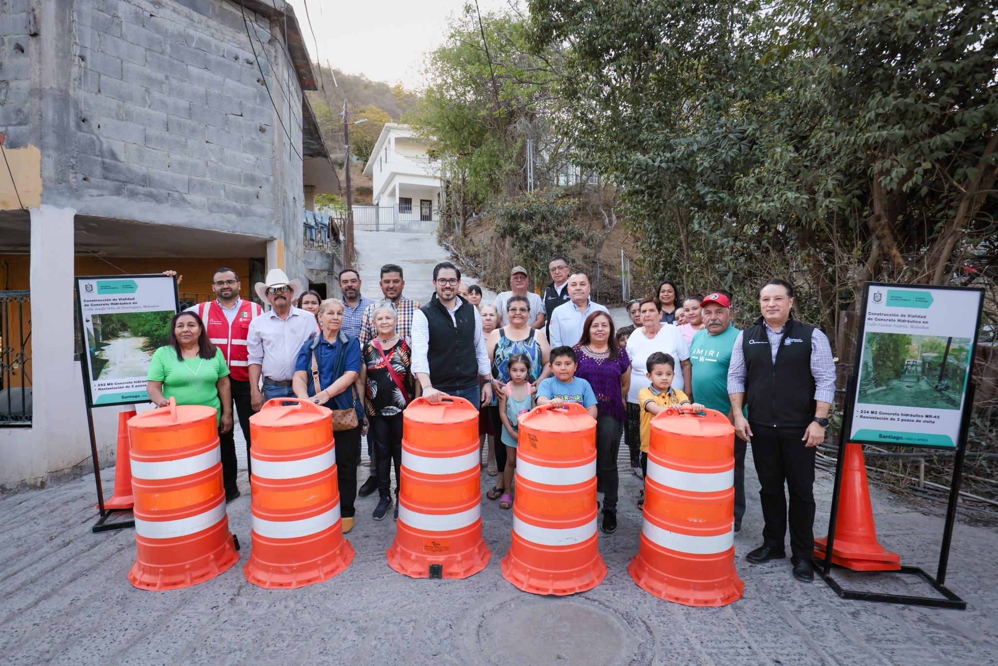 Para atender las necesidades y peticiones de los vecinos de las colonias Maleaños y Valles de Santa Rosalía, el Presidente Municipal de Santiago, David de la Peña Marroquín entregó tres nuevas vialidades de concreto hidráulico.