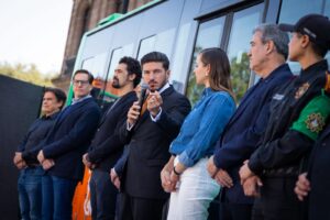 En la Explanada Cultural frente a Palacio de Gobierno y acompañado de la titular de AMAR a Nuevo León, Mariana Rodríguez Cantú, y del Secretario General de Gobierno, Miguel Ángel Flores Serna, el Mandatario estatal dijo que a cuatros años de la actual Administración estatal, los neoloneses cuentan con la movilidad que siempre debieron tener y se mueven más y mejor al contar con camiones suficientes.