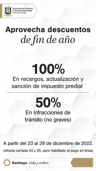 DESCUENTOS DE FIN DE AÑO EN SANTIAGO El municipio de Santiago anunció la campaña de descuentos de fin de año en la que contempla un 100 % en recargos, actualización y sanción de impuesto predial y 50 % en infracciones de tránsito calificadas como no graves.Esta campaña inicia este 23 de diciembre y estará vigente hasta el próximo día 29, los pagos se pueden realizar a través de la página web www.santiago.gob y directamente en las oficinas de tesorería, las cuales permanecen abiertas a excepción de los días 24 y 25 de diciembre. El Alcalde David de la Peña Marroquín, invitó a los santiaguenses que cuentan con rezagos, a que aprovechen estos descuentos y así estén al corriente con el pago de sus impuestos, mismos que son utilizados en beneficio de los ciudadanos, con la aplicación de los recursos en servicios públicos, seguridad pública y apoyos sociales.