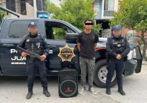 La detención ocurrió sobre la calle Ribera de los Alba, en la colonia Riberas de la Morena, donde los oficiales detectaron a un individuo que caminaba por la calle con una bocina colgada de su hombro con el volúmen alto.