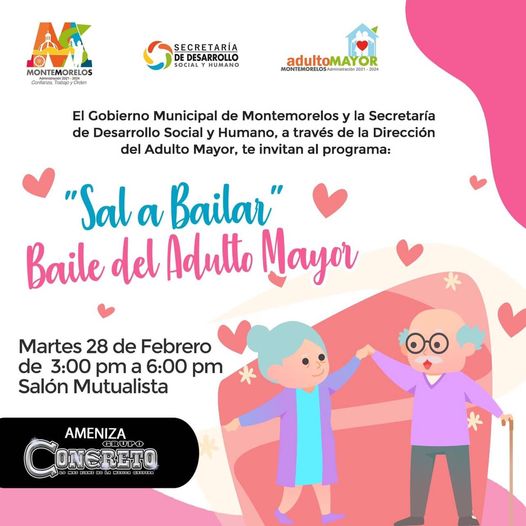 Noticias/febrero 28, 2023/281 views /Noticias Montemorelos El baile mensual del adulto mayor Sal A Bailar Y Más, se realizará mañana martes 28 de febrero: ¡Te esperamos en el Salón Mutualista📍 a partir de las 3:00 pm! ¡¡Corre la voz!share on:FacebookTwitterEmailSend to Email Address:Your NameYour Email AddressEmail check failed, please try againCancel Tags:Noticias Montemorelos previous articlePersonal Operativo de Protección Civil de General Terán al mando de su director Ángel Pablo Serratonext articleLOCALIZAN Y APOYAN EN JUÁREZ A PERRITA QUE SUFRE MALTRATORelated PostsNoticias/enero 19, 2026 Se registra en #Montemorelos accidente vial tipo salida de caminoNoticias/enero 14, 2026 #MontemorelosNL Primera Feria del Empleo 2026, el viernes 30 de enero en la Velaria del Parque Ecotemático “El Pilón”