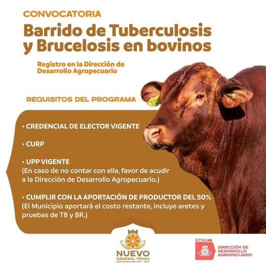 El Gobierno de General Terán 2021-2024 a través de la Dirección de Desarrollo Agropecuario convoca a los ganaderos del municipio al Barrido de Tuberculosis y Brucelosis en bovinos.