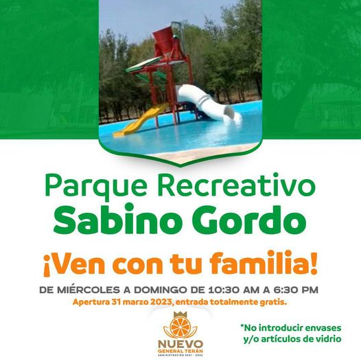 Noticias/abril 4, 2023/669 views /Noticias Terán El Gobierno de General Terán 2021-2024 te invita al Parque Recreativo “Sabino Gordo” a partir del 31 de marzo 2023.share on:FacebookTwitterEmailSend to Email Address:Your NameYour Email AddressEmail check failed, please try againCancel El Gobierno de General Terán 2021-2024 te invita al Parque Recreativo “Sabino Gordo” a partir del 31 de marzo 2023. Tags:Noticias Terán previous articleVive en familia la tradicional muestra de trailers, autos clásicos y deportivos en la «EXPO CLÁSICOS 2023», como parte de los festejos del 173 aniversario de la fundación del municipio de Allende NL. Disfruta de un ambiente 100% familiar, gastronomía y una mega discada para todos los asistentes, 3 conjuntos musicales y ¡Muchas sorpresas más!next articleEsta persona dice llamarse Kurt J. García de 43 años, se encuentra deambulando sobre Carretera Nacional en Montemorelos desde hace varios días, habla inglés y un poco español, dice ser originario de Houston Texas.Se encuentra en el albergue de Protección Civil de MontemorelosFamiliares pueden comunicarse al teléfono 826 26 3 88 88 y 826 123 00 32.Related PostsNoticias/noviembre 13, 2025 INAUGURA GOBERNADOR CLÍNICA DE REHABILITACIÓN FÍSICA EN GENERAL TERÁNNoticias/abril 29, 2023 Aviso Importante