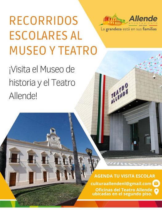 El Gobierno Municipal de Allende, a través de la Dirección de Cultura y Teatro Allende, invita a todas las Instituciones Educativas del municipio y la región a visitar y agendar sus «Recorridos Escolares al Museo de Historia y Teatro Allende». Más información en la oficina de la Dirección de Cultura ubicada en el 2o. piso del Teatro Allende. ¡Te esperamos!¡La Grandeza de Allende está en sus familias! Admón. 2021-2024.