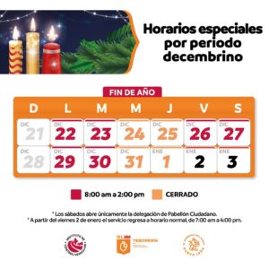 La atención en delegaciones del organismo se retomará el 2 de enero, en horario habitual, de 7:00 a 16:00 horas de lunes a viernes; y de 7:00 a 14:00 horas los sábados en Pabellón Ciudadano y Plazas Outlet.