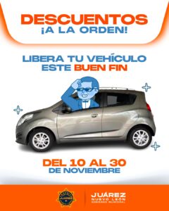 Con motivo del Buen Fin, el Gobierno Municipal de Juárez, a través de la Secretaría de Seguridad y Protección Ciudadana y la Dirección de Vialidad y Tránsito, dio  inicio a la campaña “Descuentos a la Orden”, una estrategia vigente del 10 al 30 de noviembre de 2025, que busca apoyar la economía de las familias juarenses mediante facilidades para la liberación de vehículos en corralón y la autorización de folios de licencia de conducir a precios preferenciales.