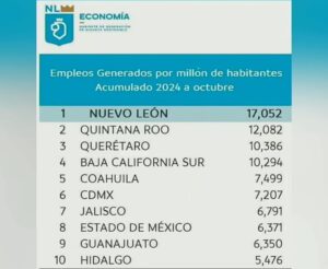 Noticias/noviembre 6, 2024/236 views /Noticias Nuevo León MANTIENE NUEVO LEÓN PRIMER LUGAR EN GENERACIÓN DE EMPLEOS POR CADA MILLÓN DE HABITANTESshare on:FacebookTwitterEmailSend to Email Address:Your NameYour Email AddressEmail check failed, please try againCancel Tags:Noticias Nuevo León previous articleIMPULSAN TURISMO SOSTENIBLE CON DATOS SÓLIDOS Y COLABORACIÓN INTERINSTITUCIONALnext articleENTREGA DAVID DE LA PEÑA NUEVAS CALLES EN EL BARRO Y EL BARRIAL Y SE COMPROMETE A MÁS