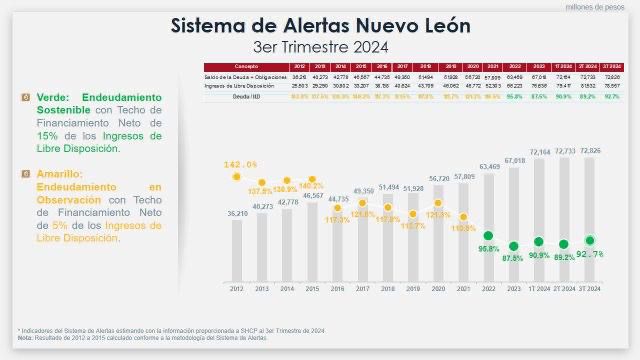 En el informe del Sistema de Alertas de la SHCP, se señala que la deuda del Gobierno de Nuevo León en el tercer trimestre de 2024 equivalió al 92.7 por ciento de sus Ingresos de Libre Disposición (ILD).