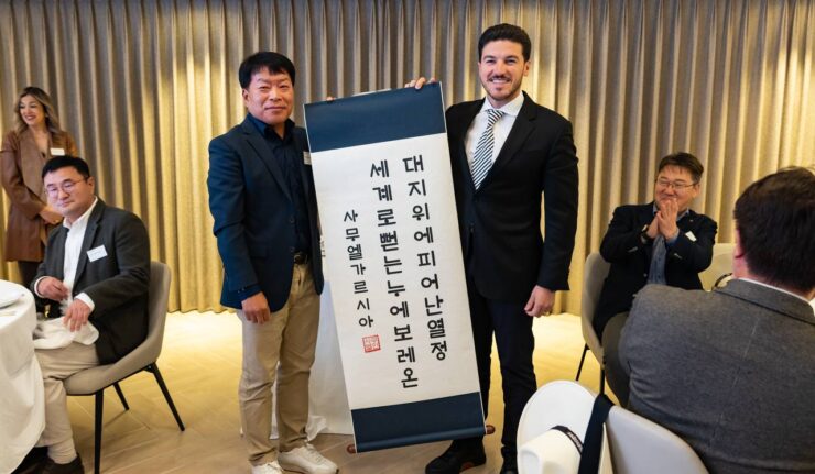 Muchas gracias a nuestros amigos de Kia Worldwide por recibirnos en este primer día de gira de trabajo en Corea. Recién comenzamos y ya anunciamos 600 MILLONES DE DÓLARES. Y también como dice en este pergamino que me regalaron: "La pasión florece en esta tierra. Nuevo León se expande al...