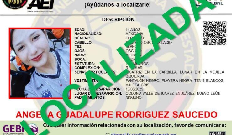 Tras activarse el protocolo de búsqueda, Cinthia Elizabeth "N", de 31 años, fue localizada en la colonia Los Cometas, en el municipio de Juárez, gracias al seguimiento puntual de la Unidad de Búsqueda Inmediata de Personas Desaparecidas de Juárez.Fue localizada la mañana del 17 de junio y regresó a su...