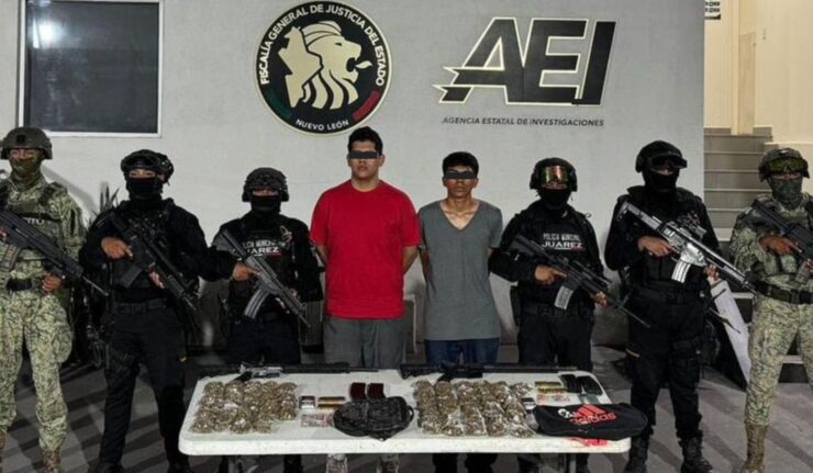 JUÁREZ, N.L. - Elementos de la Secretaría de Seguridad y Protección Ciudadana de Juárez lograron la detención de dos hombres que portaban armas largas, cartuchos útiles y varios envoltorios con hierba verde, al parecer marihuana, en la colonia Praderas de San Juan.Los hechos ocurrieron al atender una denuncia anónima, mediante...