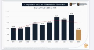 En este evento en donde participaron representantes de las corporaciones de seguridad de los tres niveles de gobierno, de la Procuraduría General de Justicia del Estado y de los municipios de la entidad se confirmó también que de enero a septiembre del presente año se registraron 586 homicidios una baja del 53 por ciento con respecto al mismo lapso del 2024.