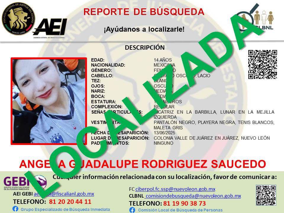 Gracias a las labores de la Unidad de Búsqueda Inmediata de Personas Desaparecidas de Juárez, fue localizada Ángela Guadalupe «N», de 14 años de edad, quien había sido reportada como no localizada desde el pasado 12 de junio.