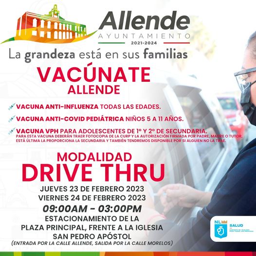 Noticias/febrero 21, 2023/262 views /Noticias Allende Vacúnate Allende en modalidad Drive-ThruVacuna Anti-Influenza, Anti-Covid Pediátrica, VPHshare on:FacebookTwitterEmailSend to Email Address:Your NameYour Email AddressEmail check failed, please try againCancel Tags:Noticias Allende previous articleEl Reparo se lleva el primer Juego de Serie Final en la Categoría 1era Fuerza en la Unidad Deportiva Niños Héroes, en Allende Pitcher Ganador Omar de Anda y relevó en la última entrada Victor Saldivar.next articleINICIAN EN SANTIAGO ASESORÍAS GRATUITAS PARA EXAMEN DE PREPARelated PostsNoticias/enero 14, 2026 Trabajador muere aplastado por caja de tráiler en AllendeNoticias/julio 17, 2025 Develan Anaquel de Hecho en Nuevo León en La Misión Supermercados