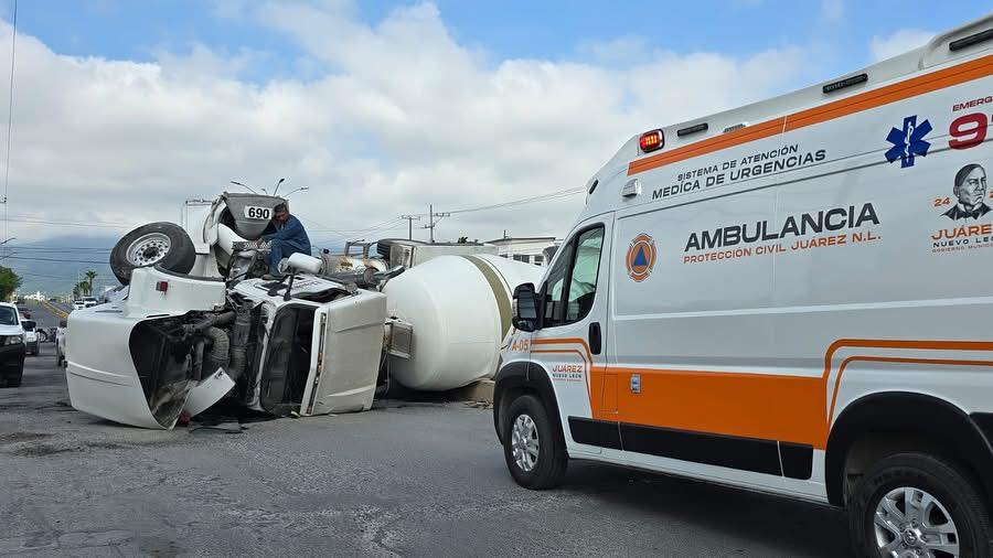 Vuelca revolvedora de concreto en carretera San Roque en Juárez, dejó a dos personas lesionadas.